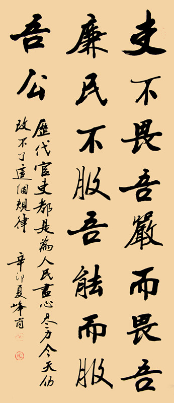 李峰岗,中国钓鱼台书画院副院长,全国人大机关书协副主席、大华书画院付院长、北京汝阳刘笔业董事长、一级美术师。自幼好书、临摹颜、欧、赵等书体,在深修大学书法理论课程同时、吸收古法、但还注重研究现代书法大家技艺、使其不断创新、形成自己的风格。作品行草宽博大气、带有碑意,字有力道,有厚度、不局促、不歼弱、作品很耐看。其书笔底见清风、天真平淡,不计工拙,洒脱自然,运、笔苍苍茫茫,剥剥落落,似有一股新清的气息扑面而来。多年来其作品先后在张伯驹诞辰11O周年获优秀奖、中国书协职工书画大赛获三等奖。2013年书画频道春节迎联大赛获奖三十多次曾被德国议会、日本、马来西亚、台湾、香港、等国和地区政要收藏,深受他们的青睐,得到社会好评!